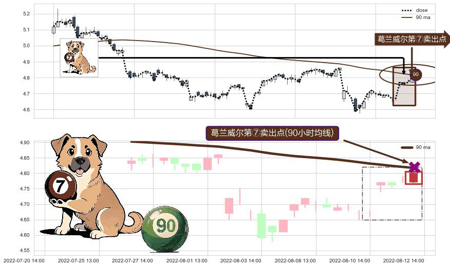 ⚀ 2022-08-12 14:00:00-小时显现 葛兰威尔均线 90小时均线 第⑦卖出点 下降趋势的中继信号,后市看跌,卖出信号