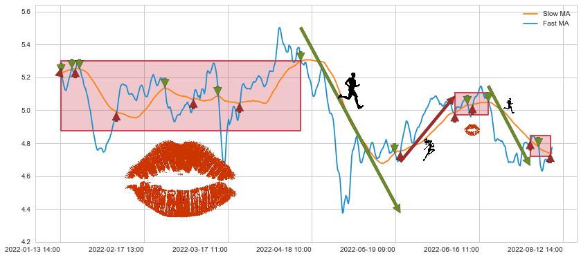 06-08 15:00至06-21 14:00 慢线与快线多次接触,存在上下穿越,有缠绕
