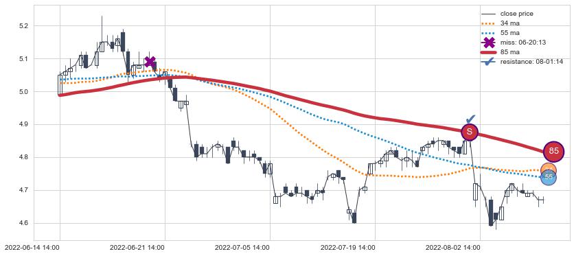 ⚅ 均线向上突破后,2022-06-16 14:00:00-小时价格上探超过 正乖离率超卖第二卖点 :4.6850667953652465后开始止涨下跌再次均线破位