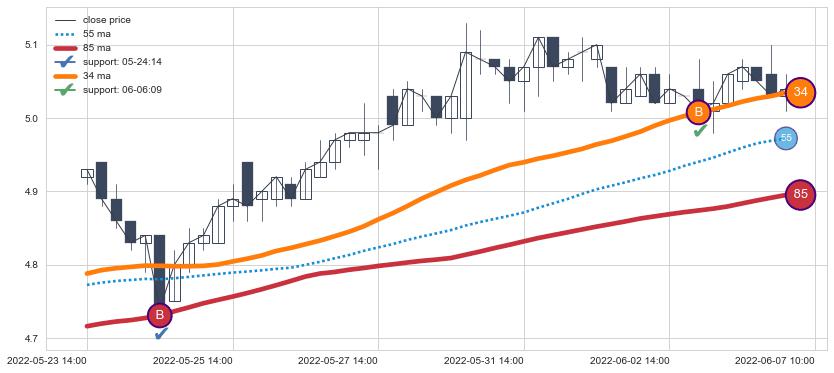 ⚂ 2022-05-27 11:00:00-小时均线向上突破,2022-06-24 13:00:00-小时重新下穿均线破位,均线阻力再次生效