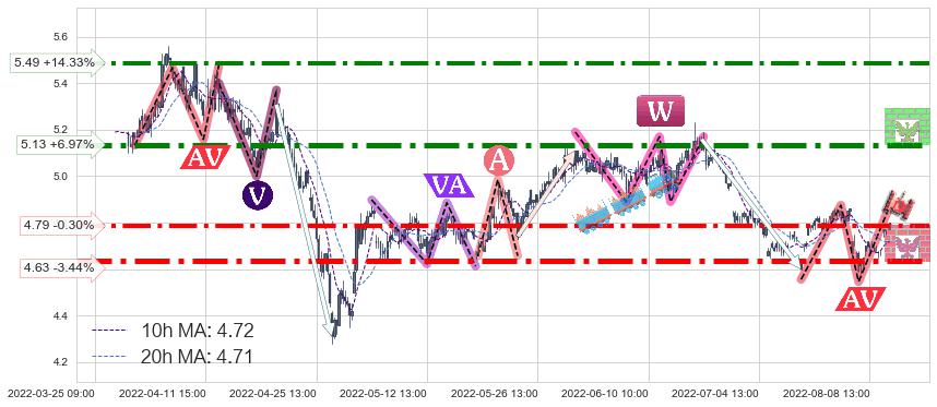 ➢ 【仅预测突破】最后价格:4.80与预测突破价格:4.83→【空间中等】后续最小【整理】第一目标价格→(08-23:12: 5.28 )