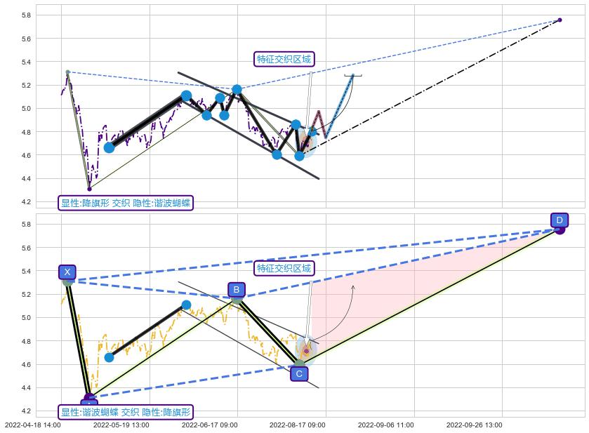 ➣ 【未确认突破,预测即将形成突破】降⚑旗形起点:05-06:11, 预测突破点:08-12:15,形态共232交易小时