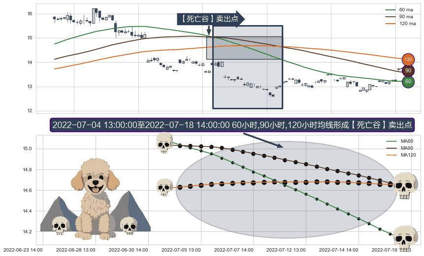 ⚀ 2022-07-04 14:00:00-小时至2022-07-18 14:00:00-小时显现 60小时-90小时-120小时均线 【死亡谷】卖出点 看空信号,后市看跌,卖出