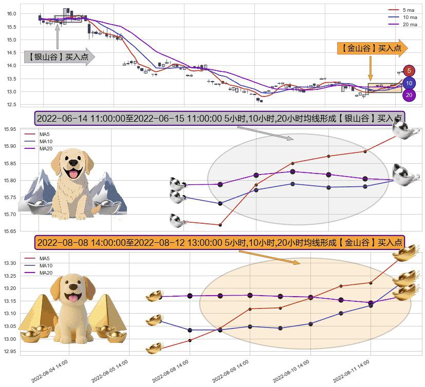 ⚄ 2022-08-09 13:00:00-小时至2022-08-12 13:00:00-小时显现 5小时-10小时-20小时均线 【金山谷】买入点 其再次确认了买入信号,可靠性更强,买入