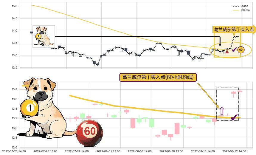 ⚀ 2022-08-11 13:00:00-小时显现 葛兰威尔均线 60小时均线 第买①入点 走势反转见底信号,后市看涨,买进信号