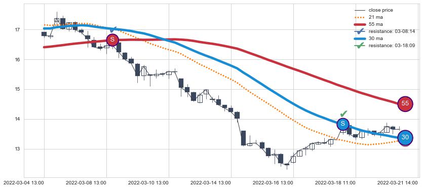 ⚀ 2022-06-15 14:00:00小时显现 10小时-20小时-30小时均线 【断头铡刀】卖出点 看空信号,后市看跌,卖出