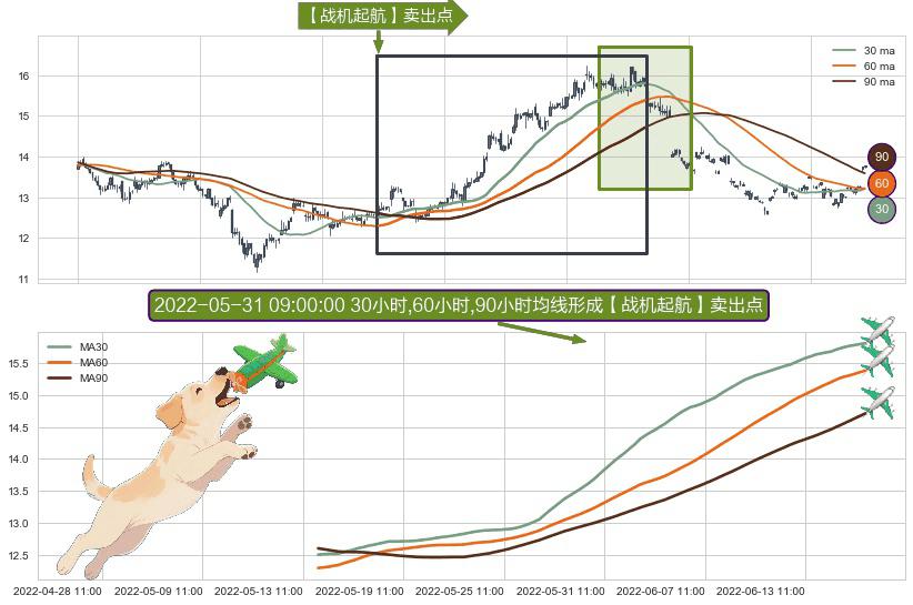 ⚀ 2022-05-16 09:00:00小时-2022-06-15 14:00:00小时显现 30小时-60小时-90小时均线 【战机起航】卖出点 看空信号,后市看跌,卖出