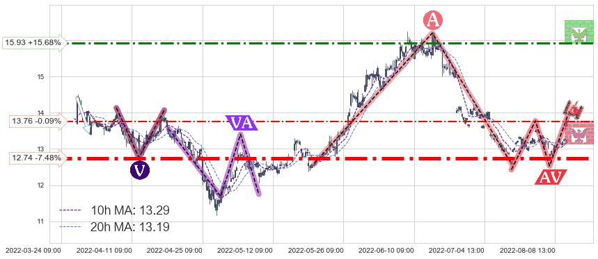 ♘ 阻力价格位15.93,可信任强度56.47%,距离最后交易2022-08-12 14:00形成的收盘价格13.77相差 +15.68%