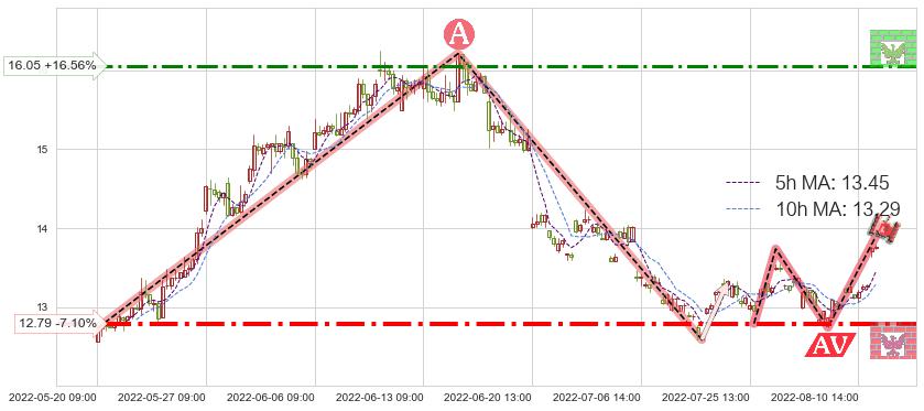 ♘ 阻力价格位16.05,可信任强度57.79%,距离最后交易2022-08-12 14:00形成的收盘价格13.77相差 +16.56%