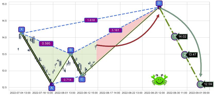 ➣ 未完成【螃蟹】形态起点X: 06-28:13, 已到达C点: 08-04:13, 预测最终D点: 08-24:14, 共124交易小时