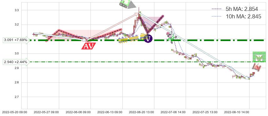 ♘ 阻力价格位2.940,可信任强度46.68%,距离最后交易2022-08-12 14:00形成的收盘价格2.870相差 +2.44%