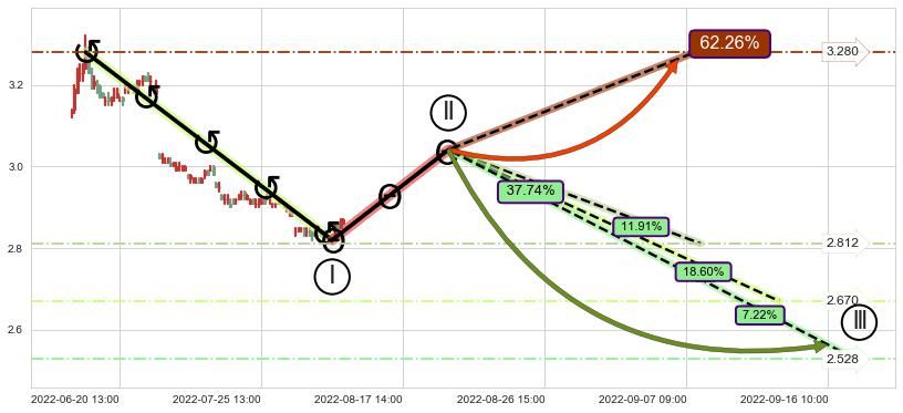 ➢ 循环浪继续向下【最高】位置(09-07:14, 2.812),匹配聚类样本比例31.57%, 可能性概率11.91%
