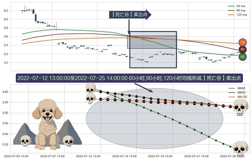 ⚀ 2022-07-12 14:00:00-小时至2022-07-25 14:00:00-小时显现 60小时-90小时-120小时均线 【死亡谷】卖出点 看空信号,后市看跌,卖出