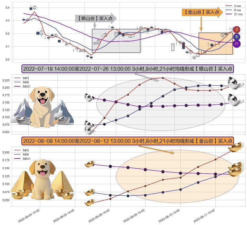 ⚄ 2022-08-09 13:00:00-小时至2022-08-12 13:00:00-小时显现 3小时-8小时-21小时均线 【金山谷】买入点 其再次确认了买入信号,可靠性更强,买入