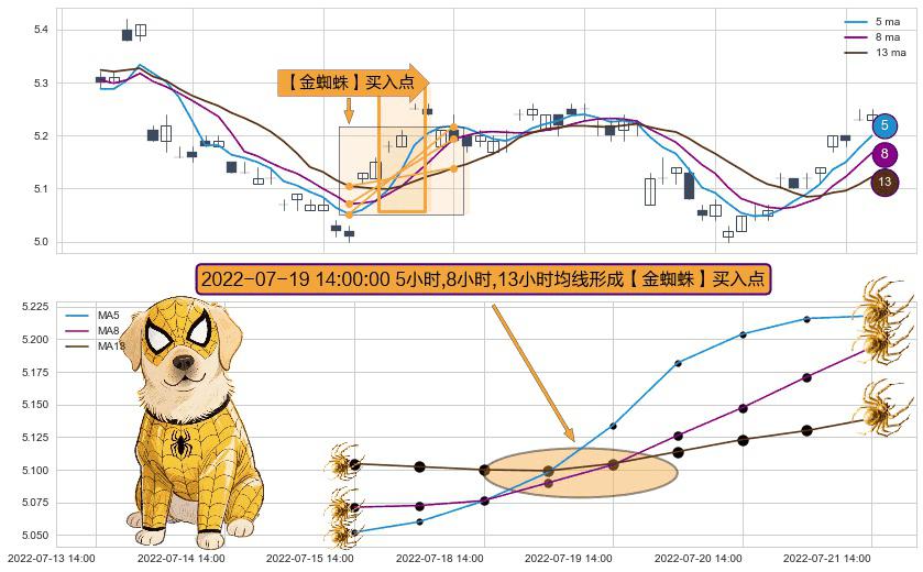 ⚀ 2022-07-19 14:00:00小时显现 5小时-8小时-13小时均线 【金蜘蛛】买入点 看多信号,后市看涨,买入