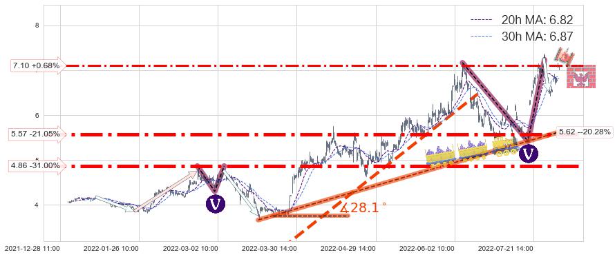 ♘ 支撑价格位7.10,可信任强度55.24%,距离最后交易2022-08-12 14:00形成的收盘价格7.05相差 +0.68%