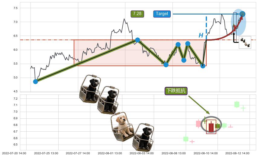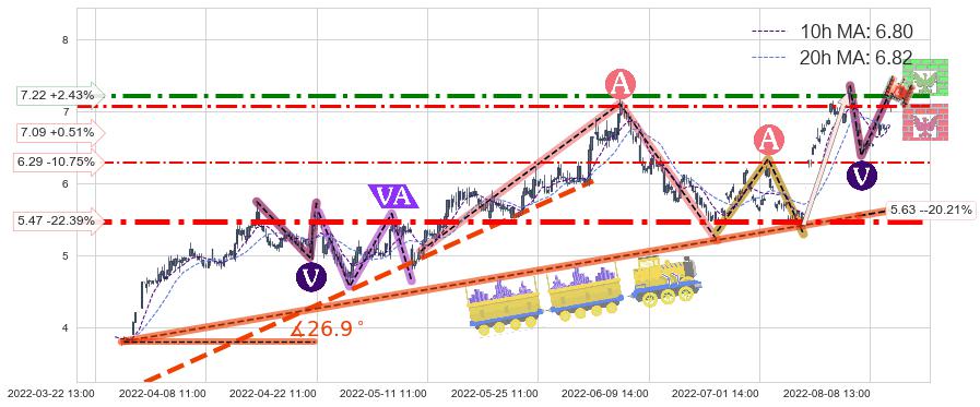 ♘ 阻力价格位7.22,可信任强度73.25%,距离最后交易2022-08-12 14:00形成的收盘价格7.05相差 +2.43%