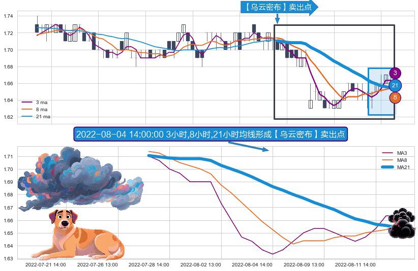 ⚀ 2022-07-27 14:00:00小时-2022-08-12 14:00:00小时显现 3小时-8小时-21小时均线 【乌云密布】卖出点 看空信号,后市看跌,卖出