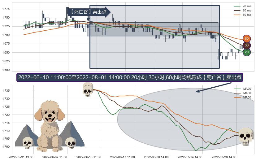 ⚀ 2022-06-10 13:00:00-小时至2022-08-01 14:00:00-小时显现 20小时-30小时-60小时均线 【死亡谷】卖出点 看空信号,后市看跌,卖出