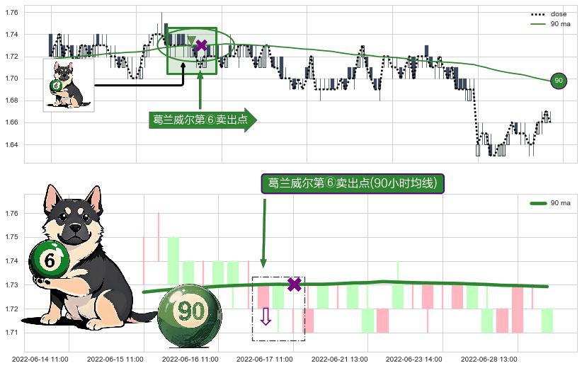 ⚀ 2022-06-17 09:00:00-小时显现 葛兰威尔均线 90小时均线 第⑥卖出点 走势反转见顶信号,后市看跌,卖出信号