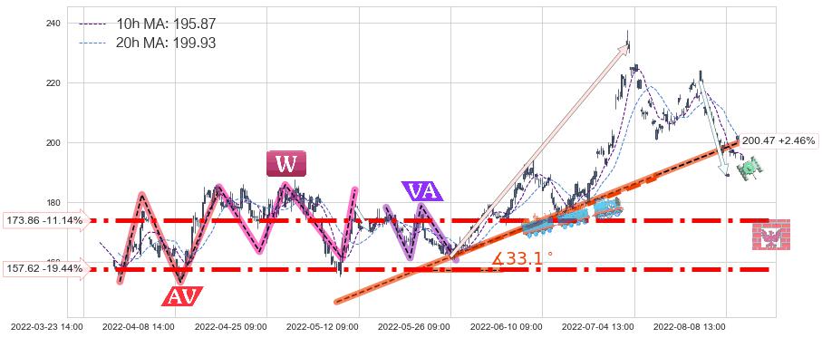 ➣ 2022-05-09 13:00-2022-07-12 13:00上升趋势存在反转[风险],虽然原上升趋势的支撑位(200.47)已破位,但其支撑效果尚存,原上升趋势角度: 33.1˚