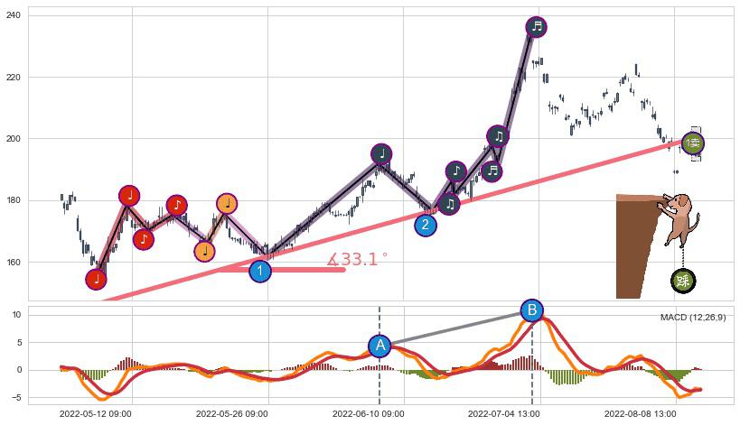 从2022-05-09 13:00至2022-07-12 13:00,共包含175个小时,阶段股价上涨27.94%,阶段股价变动位移路程比: 1 : 6,上涨趋势角度: 33.1