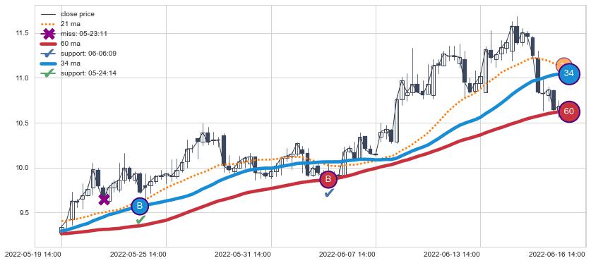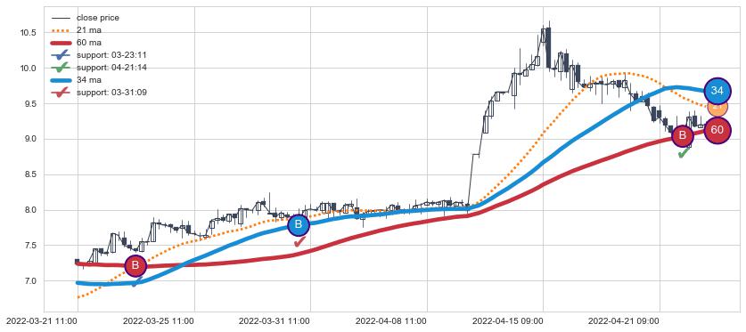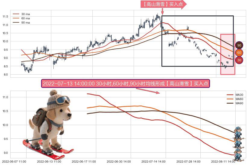 ⚀ 2022-06-16 11:00:00小时-2022-08-11 14:00:00小时显现 30小时-60小时-90小时均线 【高山滑雪】买入点 看多信号,后市看涨,买入