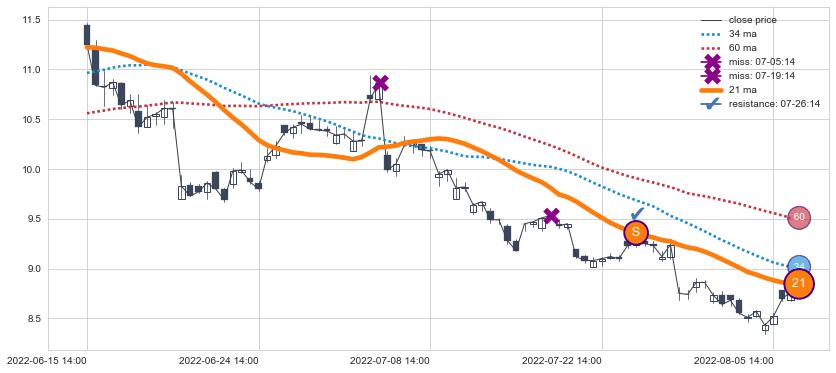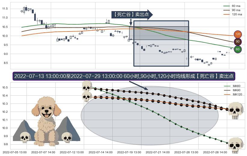 ⚀ 2022-07-13 14:00:00-小时至2022-07-29 13:00:00-小时显现 60小时-90小时-120小时均线 【死亡谷】卖出点 看空信号,后市看跌,卖出