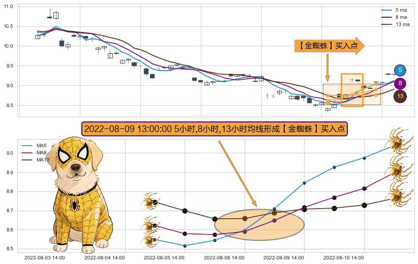 ⚀ 2022-08-09 13:00:00小时显现 5小时-8小时-13小时均线 【金蜘蛛】买入点 看多信号,后市看涨,买入