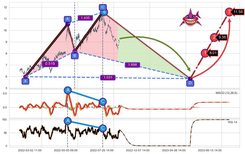 ➣ 未完成【鲨鱼】形态起点X: 01-28:11, 已到达C点: 06-15:09, 预测最终D点: 05-15:14, 共906交易小时