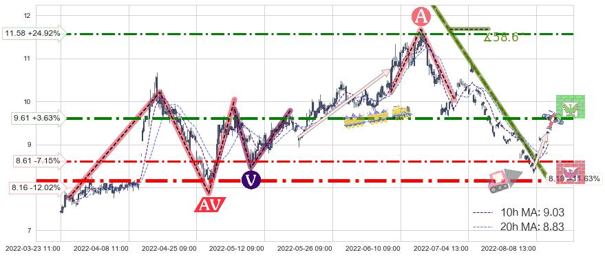 ♘ 阻力价格位9.61,可信任强度70.90%,距离最后交易2022-08-12 14:00形成的收盘价格9.27相差 +3.63%