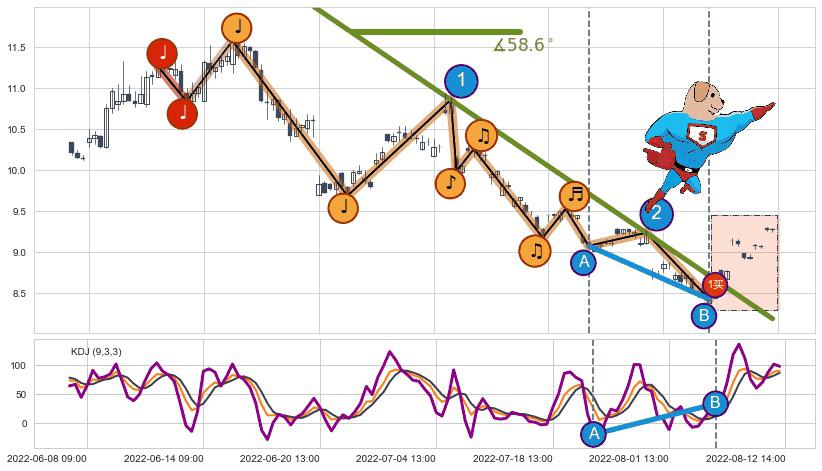 从2022-06-08 14:00至2022-08-11 14:00,共包含114个小时,阶段股价下跌-17.23%,阶段股价变动位移路程比: 1 : 7,下跌趋势角度: 58.6