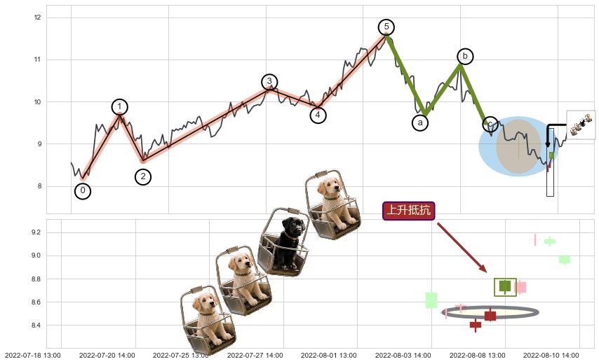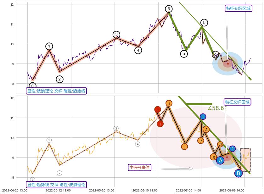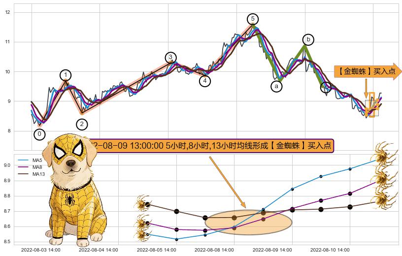 从2022-08-05 13:00至2022-08-12 14:00,共包含12个小时,阶段股价上涨9.67%,阶段股价变动位移路程比: 1 : 1.5