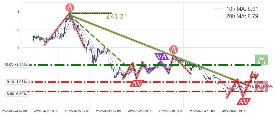 ♘ 在最后的下跌阶段2022-04-14 13:00至2022-07-21 14:00,存在 破位边缘的阻力位 ,阻力价格8.82,可信任强度76.27%,其距离最后价格9.19相差 -3.99%