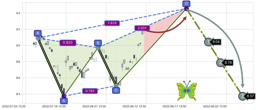➣ 未完成【蝴蝶】形态起点X: 07-07:13, 已到达C点: 08-03:14, 预测最终D点: 08-17:14, 共75交易小时