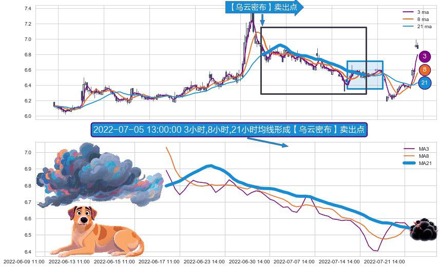 ⚀ 2022-06-16 14:00:00小时-2022-07-25 13:00:00小时显现 3小时-8小时-21小时均线 【乌云密布】卖出点 看空信号,后市看跌,卖出