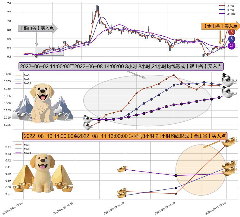 ⚀ 2022-08-11 13:00:00-小时至2022-08-11 13:00:00-小时显现 3小时-8小时-21小时均线 【金山谷】买入点 其再次确认了买入信号,可靠性更强,买入