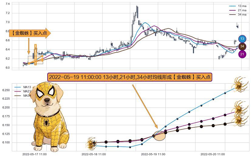 ⚀ 2022-05-19 11:00:00小时显现 13小时-21小时-34小时均线 【金蜘蛛】买入点 看多信号,后市看涨,买入