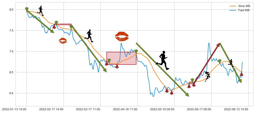 02-10 14:00至02-23 14:00 慢线与快线多次接触,存在上下穿越,有缠绕