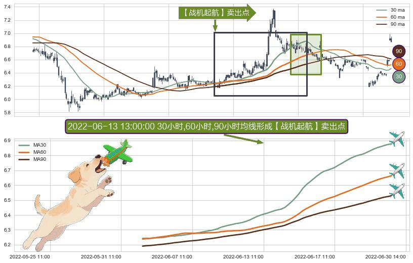 ⚀ 2022-06-01 13:00:00小时-2022-06-28 14:00:00小时显现 30小时-60小时-90小时均线 【战机起航】卖出点 看空信号,后市看跌,卖出