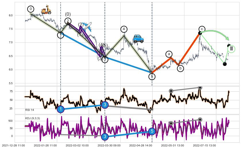 ➣ a,c调整浪MACD, RSI, KDJ走势都【未出现】背离,abc走势延续, 5浪反转概率增强
