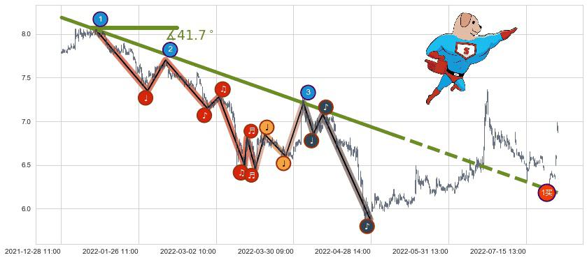 ⚔️ 2021-12-28 13:00-2022-05-11 10:00下跌趋势存在反转上涨[机会],其原下跌趋势的阻力位(6.18)已被突破[强支撑信号],原下跌趋势角度: 41.7˚