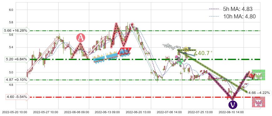 ♘ 阻力价格位4.87,可信任强度39.33%,距离最后交易2022-08-12 14:00形成的收盘价格4.87相差 +0.10%