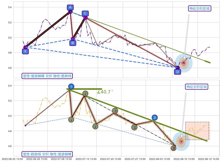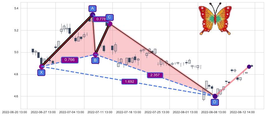 ➣ 已完成【蝴蝶】形态起点X: 06-22:14, 终点D: 08-04:13, 共62交易小时