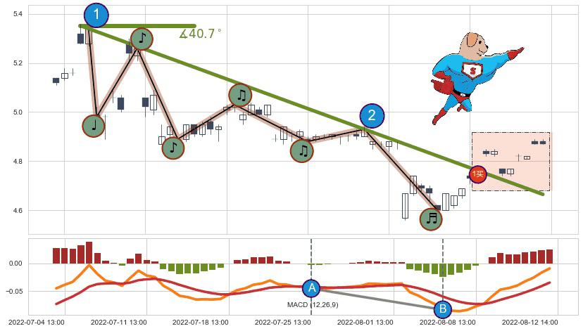 从2022-07-05 13:00至2022-08-11 14:00,共包含56个小时,阶段股价下跌-8.28%,阶段股价变动位移路程比: 1 : 7,下跌趋势角度: 40.7,2022-07-06 13:00向↘︎形成缺口,跳空下跌-6.74%˚