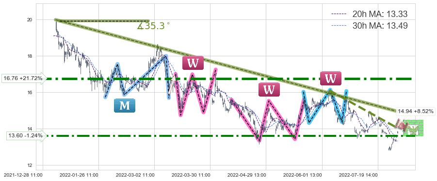 ♞ 20小时均线:13.33,30小时均线:13.49→ 快线<慢线