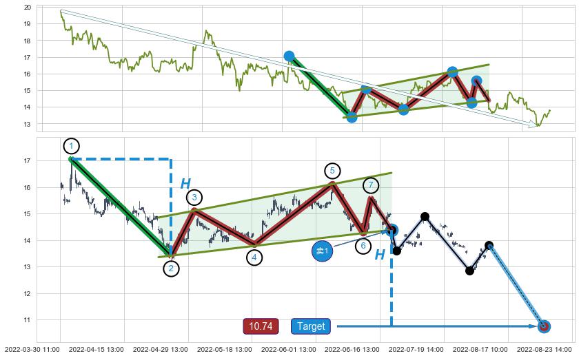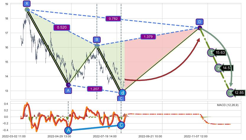 ➣ D点拟合预测价格17.35,距离最后交易收盘价格13.77相差 +25.97%