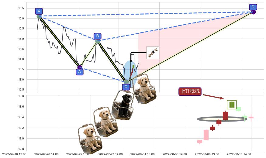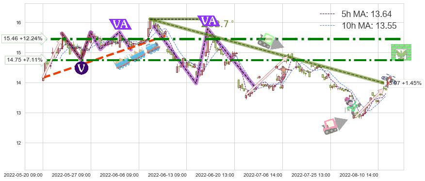♘ 在最后的下跌阶段2022-06-07 10:00至2022-08-11 14:00,存在 持续未破位的阻力位 ,阻力价格13.97,可信任强度81.25%,其距离最后价格13.77相差 +1.45%