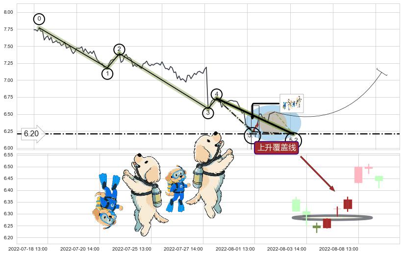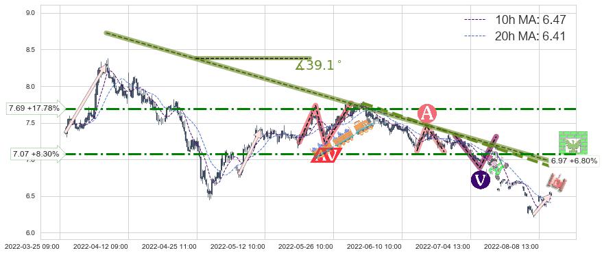 ♘ 阻力价格位7.07,可信任强度56.40%,距离最后交易2022-08-12 14:00形成的收盘价格6.53相差 +8.30%