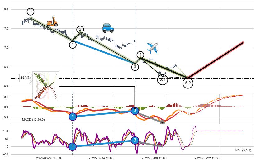 从2022-05-06 11:00至2022-05-19 09:00,共包含44个小时,阶段股价上涨6.20%,阶段股价变动位移路程比: 1 : 4